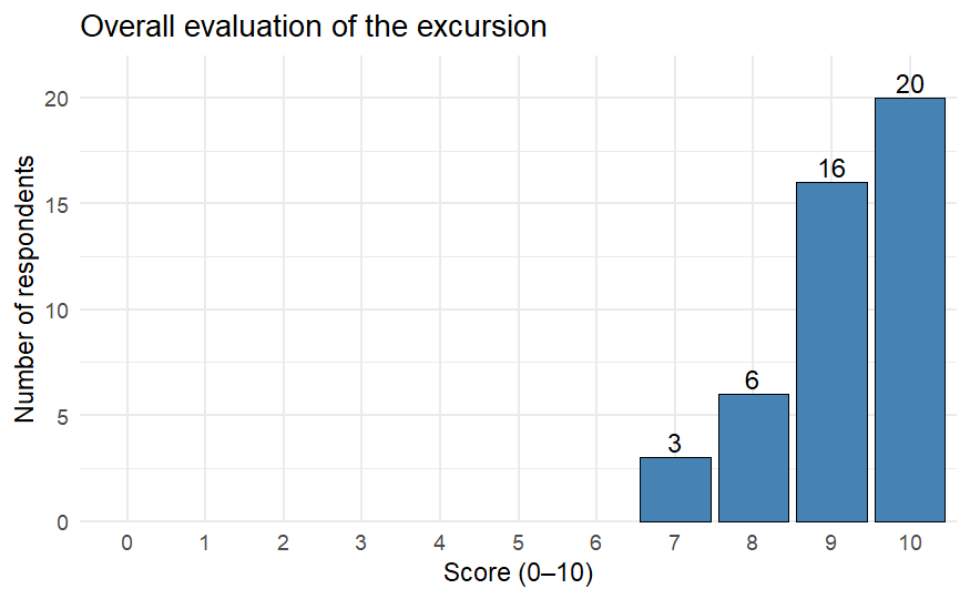 Participants evaluated the excursion very positively. On a 0–10 scale, the mean score was 9.2 (±0.9). Scores ranged from 7 to 10, with the majority assigning the highest ratings (20 respondents gave a score of 10, 16 gave a score of 9, Fig. 1). Only three participants rated the excursion with 7, and six with 8.