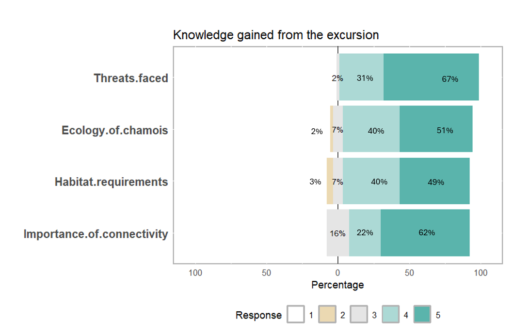 Taken together, these results demonstrate that the excursion was highly effective not only in transmitting ecological knowledge and conservation values, but also in fostering emotional, experiential, and social connections with the chamois and its environment. Such activities can therefore play a crucial role in building support for biodiversity conservation and citizen engagement.