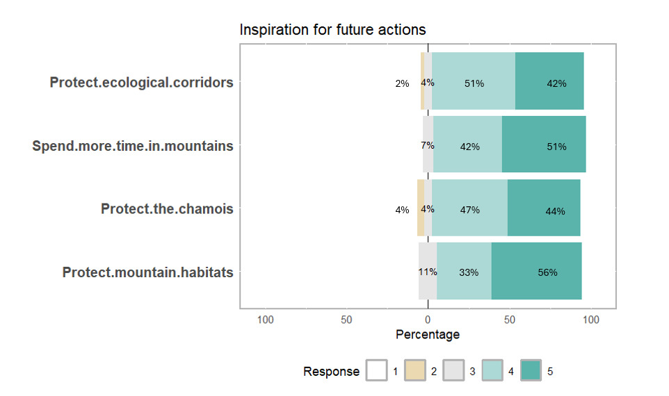 Participants reported that the excursion provided a strong source of inspiration for future actions. Reported motivation was consistently high across all four items, with mean values ranging from 4.31 to 4.44. More than 90% of respondents selected “much” or “very much” for spending more time in the mountains and contributing to the protection of mountain habitats, while similarly high proportions indicated support for protecting the chamois and maintaining ecological corridors (Fig. 4). Only a small minority selected medium or lower values.