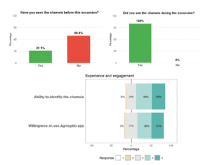 Figure 5. Participants’ experiences and engagement with the excursion. Top: percentage of respondents who had previously seen the chamois and those who observed it during the excursion (Yes = green, No = red). Bottom: participants’ self-reported ability to identify the chamois and their willingness to use the Agriogido app for reporting observations, assessed on a Likert scale (1–5), where 1 = not at all, 2 = a little, 3 = medium, 4 = much, and 5 = very much