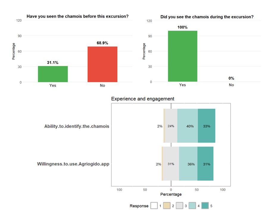 Figure 5. Participants’ experiences and engagement with the excursion. Top: percentage of respondents who had previously seen the chamois and those who observed it during the excursion (Yes = green, No = red). Bottom: participants’ self-reported ability to identify the chamois and their willingness to use the Agriogido app for reporting observations, assessed on a Likert scale (1–5), where 1 = not at all, 2 = a little, 3 = medium, 4 = much, and 5 = very much.