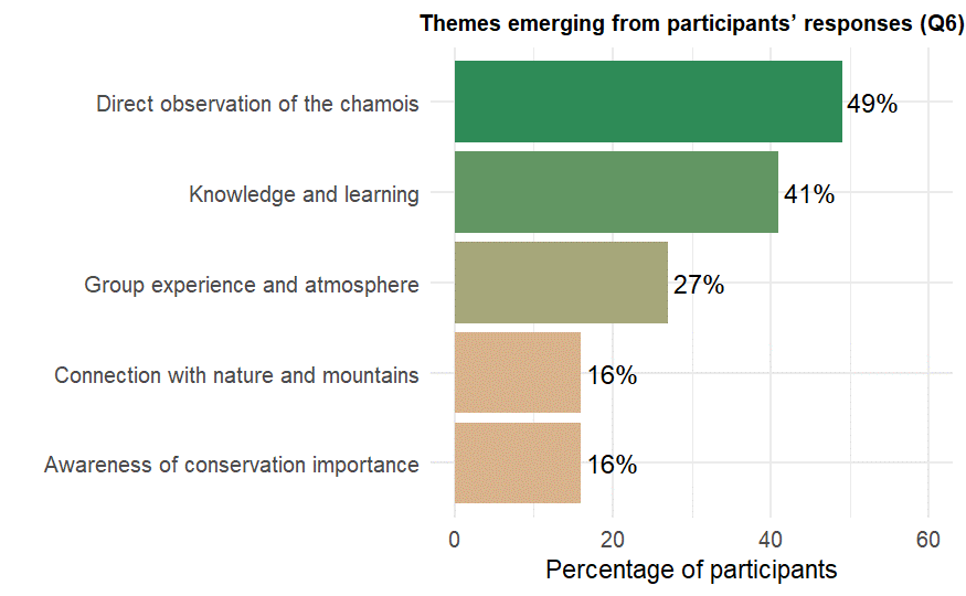 Participants’ open-ended responses provided rich qualitative insights into the impact of the excursion. Thematic analysis of the responses revealed these five categories, summarized in Table 1 and Figure 6 along with illustrative quotes translated into English. Nearly half of respondents (49%) emphasized the unique opportunity to directly observe the chamois in its natural habitat, often describing this as an impressive and memorable moment. A large proportion (41%) highlighted the knowledge they gained about the species’ ecology, biology, and conservation, ranging from detailed aspects of its behavior and anatomy to a broader ecological understanding. Several responses (16%) stressed that the excursion deepened their awareness of the need to protect the chamois and its habitats, underlining the importance of conservation action. Others (16%) underlined the value of spending time in nature and the mountains, which fostered a sense of connection to the landscape. Finally, more than a quarter of participants (27%) referred to the positive social dimension of the group experience, emphasizing the good atmosphere, shared learning, and enjoyment of participating together.